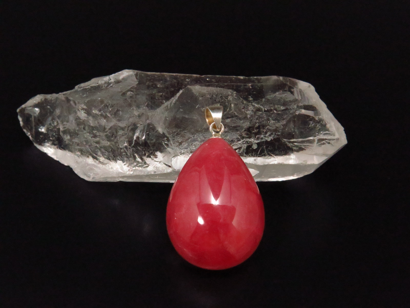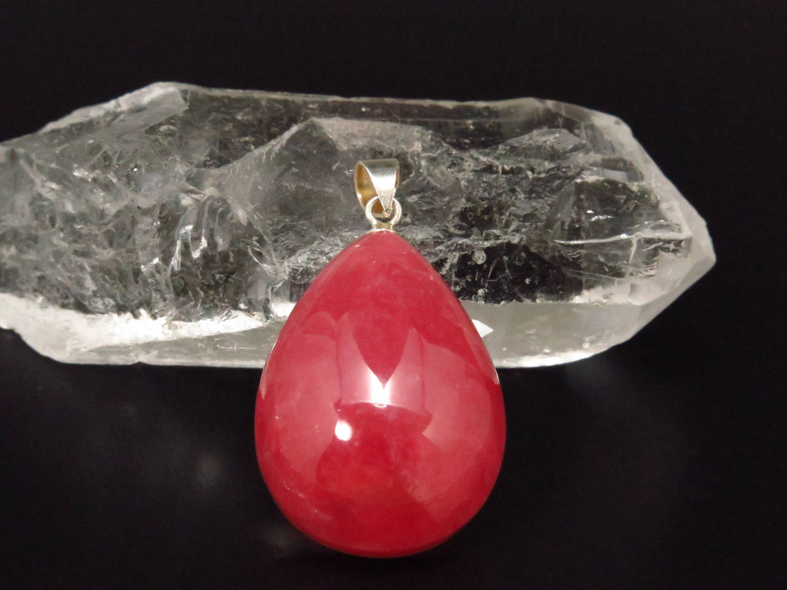 可愛らしくて、美しい紅赤色です。色・艶ともに抜群の高品質です。枠に囲まれていないタイプのペンダントですので、全体を見ることが出来る点もお薦めです。 |